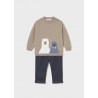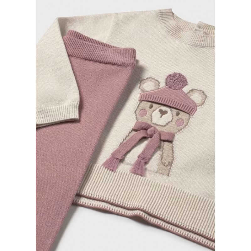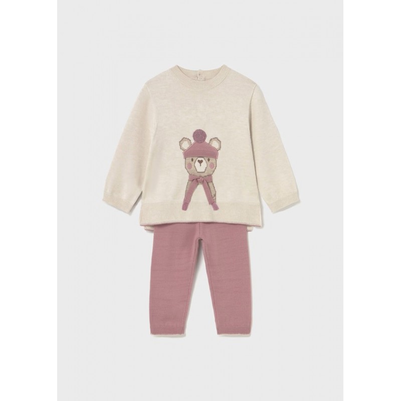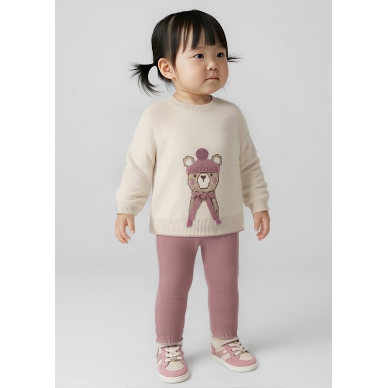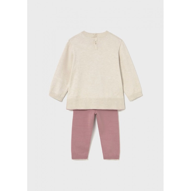 Комплект із дитячого светра та довгих штанів у тон. Дитячий светр з довгими рукавами. Округлий виріз. Застібка на ґудзики ззаду для легкого одягання та знімання. Зручна трикотажна тканина. Оздоблення: вишивка, ребристі деталі. Дитячі штани. Еластичний пояс. Оздоблення: ребристі деталі.