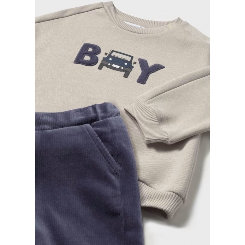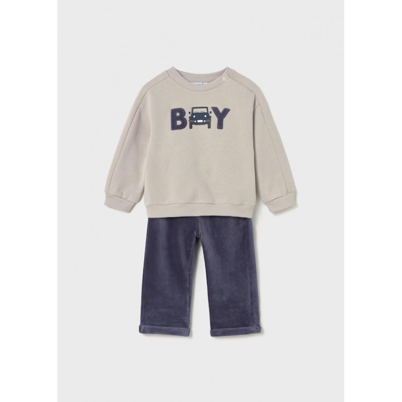 Дитячий світшот з довгими рукавами. Круглий комір. Застібки на кнопках на плечі для зручного одягання. Декоративні елементи: декоративна аплікація, шовкотрафаретний друк. Друк з мотивами автоспорту. Дитячі штани. Регульований пояс зі шнурком. Тепла, зручна та м'яка вельветова тканина. Підгорнутий поділ.