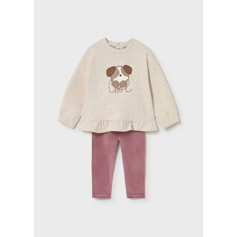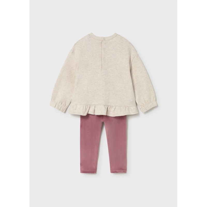 Світшот з довгими рукавами та еластичними манжетами. Круглий комір. Застібка на кнопці ззаду. Махрова та рюшована обробка. Декоративні елементи: аплікації, вишивка. Легінси для малюків. Еластичний пояс. Однотонний дизайн.
