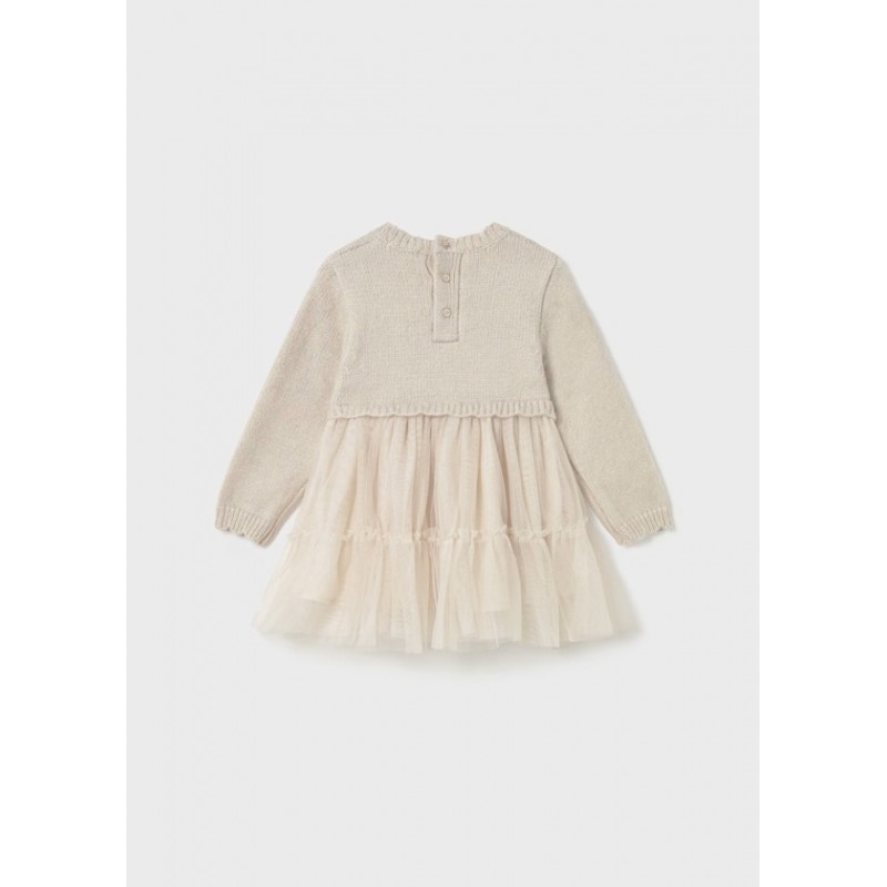Хвилястий виріз горловини. Імітація вирізу горловини з трикотажним верхом. Застібка на ґудзики ззаду для легкого одягання та знімання. Виготовлена з легкого, струмливого фатину. Підкладка з м'якого поліестеру. Декоративні аплікації.