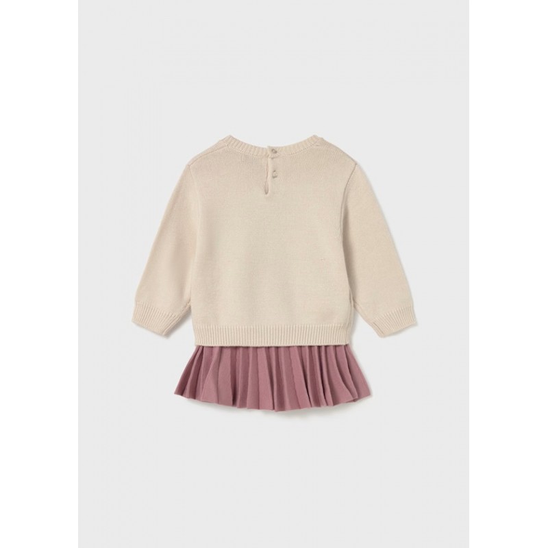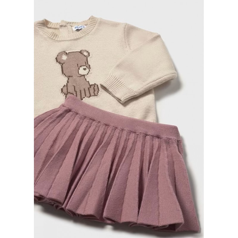 Комплект дитячого светра та спідниці в тон. Дитячий светр з довгими рукавами. Застібка на ґудзики ззаду для легкого одягання та знімання. Зручна трикотажна тканина. Ребриста обробка. В'язаний візерунок інтарсія. Дитяча спідниця. Еластичний пояс. Плісований дизайн.