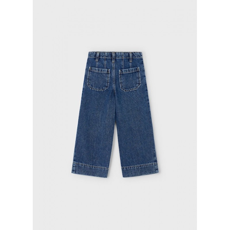 Штани-кльош для дівчаток з широким подолом. Регульований еластичний пояс на ґудзиках для кращої посадки. Зручний, універсальний денім для повсякденного образу. Плісований дизайн. Функціональні передні кишені.