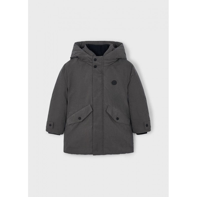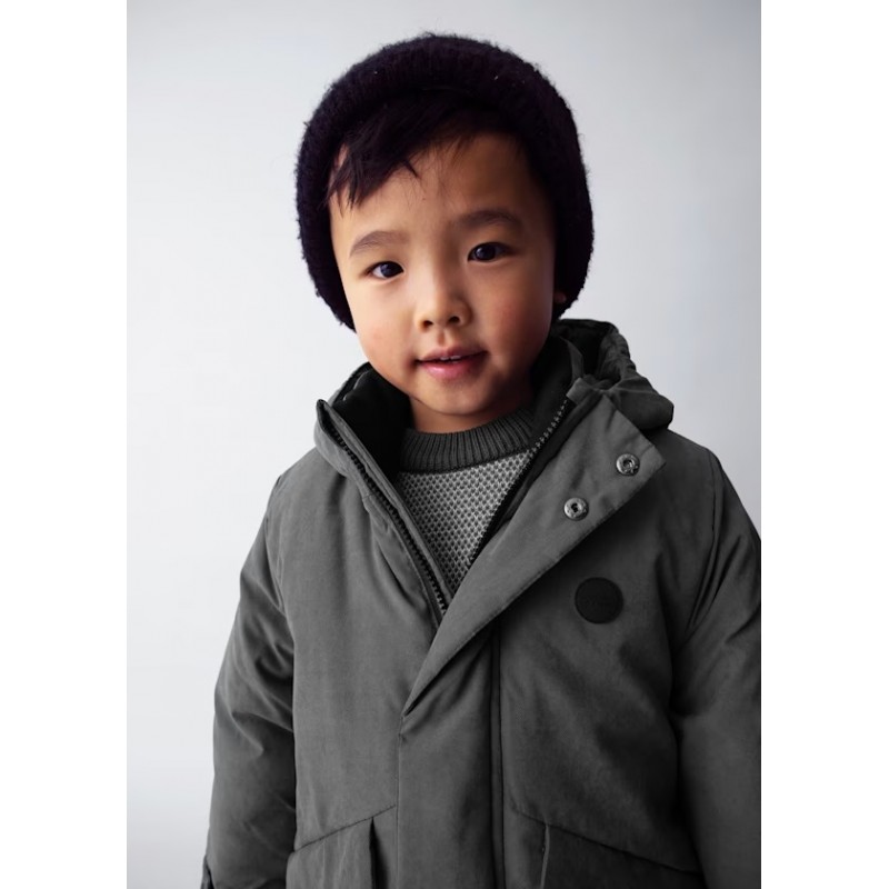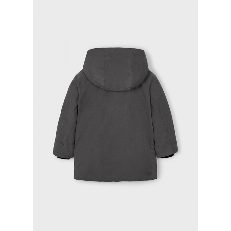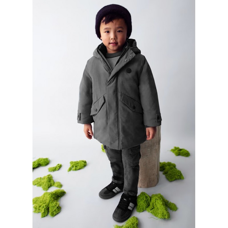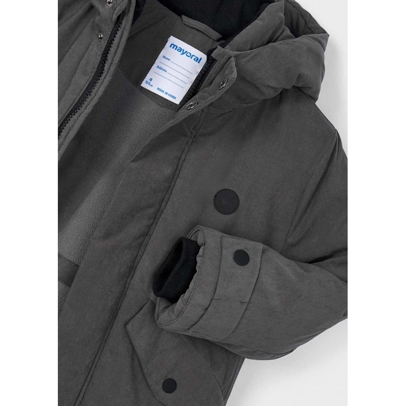 Комір з капюшоном. Застібка на блискавку та ґудзики. М'яка поліестерова підкладка. Функціональні передні кишені.