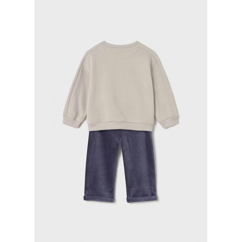 Дитячий світшот з довгими рукавами. Круглий комір. Застібки на кнопках на плечі для зручного одягання. Декоративні елементи: декоративна аплікація, шовкотрафаретний друк. Друк з мотивами автоспорту. Дитячі штани. Регульований пояс зі шнурком. Тепла, зручна та м'яка вельветова тканина. Підгорнутий поділ.
