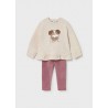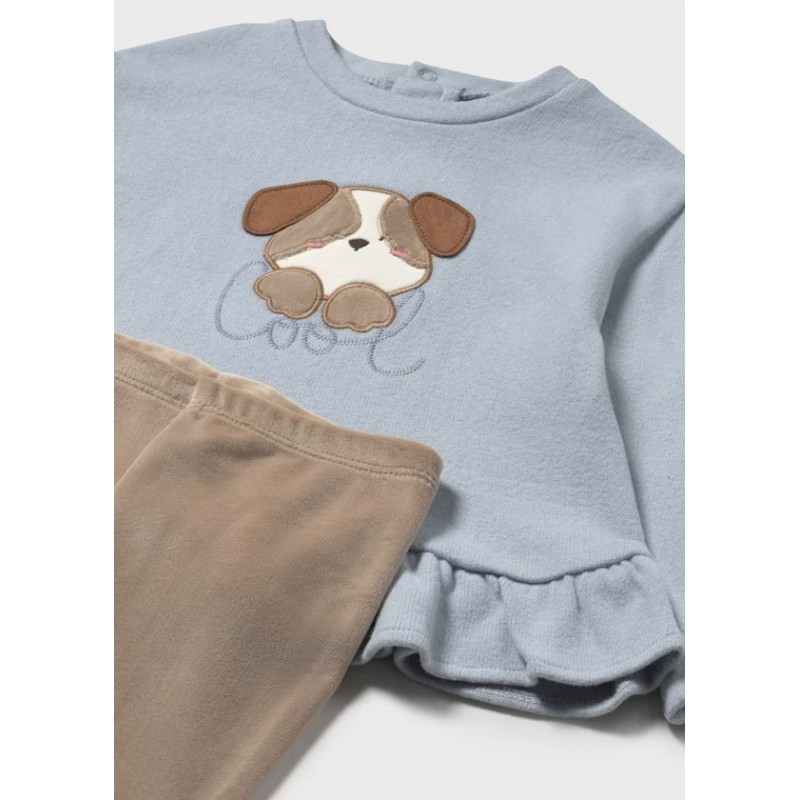 Світшот з довгими рукавами та еластичними манжетами. Круглий комір. Застібка на кнопці ззаду. Махрова та рюшована обробка. Декоративні елементи: аплікації, вишивка. Легінси для малюків. Еластичний пояс. Однотонний дизайн.