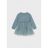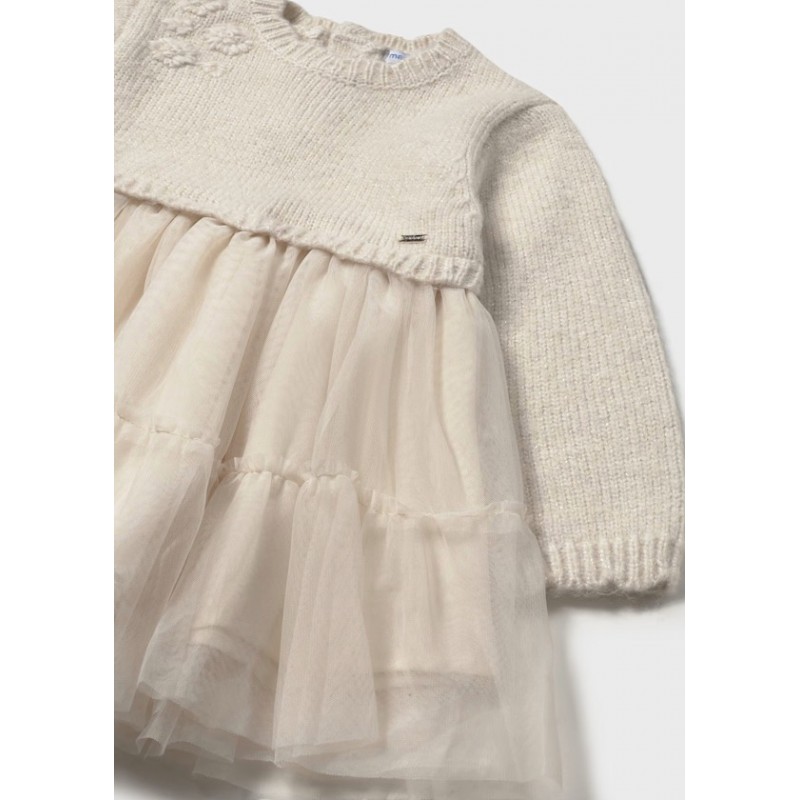 Хвилястий виріз горловини. Імітація вирізу горловини з трикотажним верхом. Застібка на ґудзики ззаду для легкого одягання та знімання. Виготовлена з легкого, струмливого фатину. Підкладка з м'якого поліестеру. Декоративні аплікації.