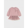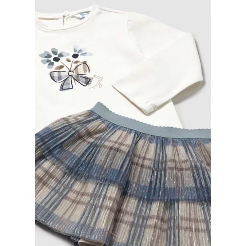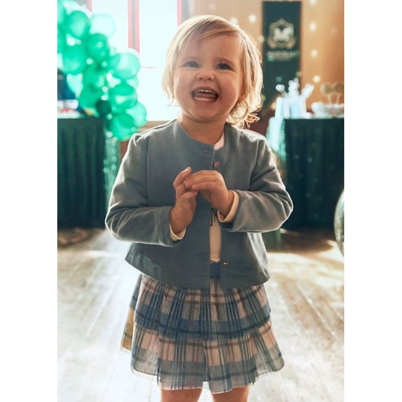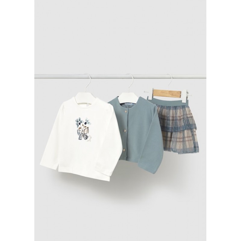 Комплект із трьох предметів: кардиган, реглан та спідниця в тон. Дитячий кардиган з довгими рукавами. Круглий комір. Застібка на ґудзики спереду. Реглан з довгими рукавами. Круглий комір. Застібка на ґудзики на горловині для зручного одягання. Прикраса з трафаретним друком. Дитяча спідниця. Еластичний пояс.