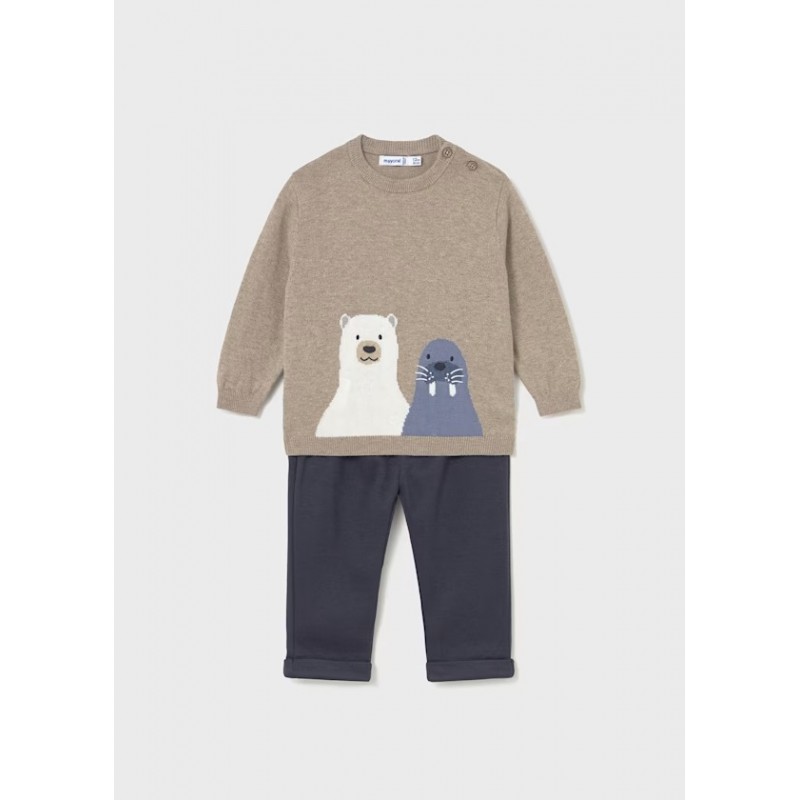 Дитячий светр з довгими рукавами. Круглий виріз горловини. Застібка на ґудзики на горловині для легкого регулювання. Вишита обробка. В'язаний візерунок інтарсія. Дитячі штани. Еластичний пояс із застібкою на ґудзики. Виріб з еластичним низом, що адаптується до зросту вашої дитини.