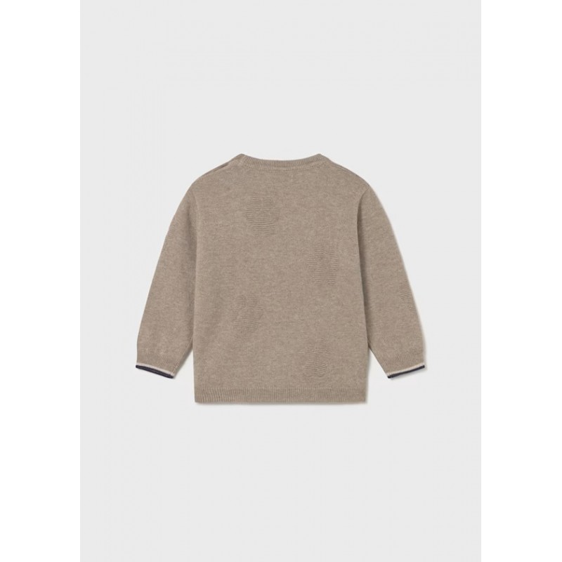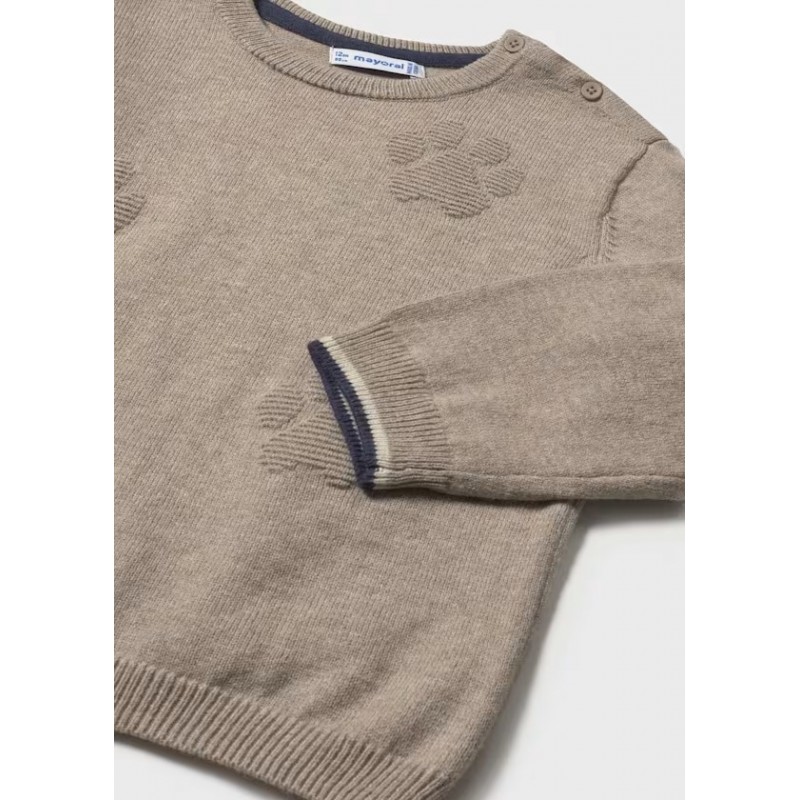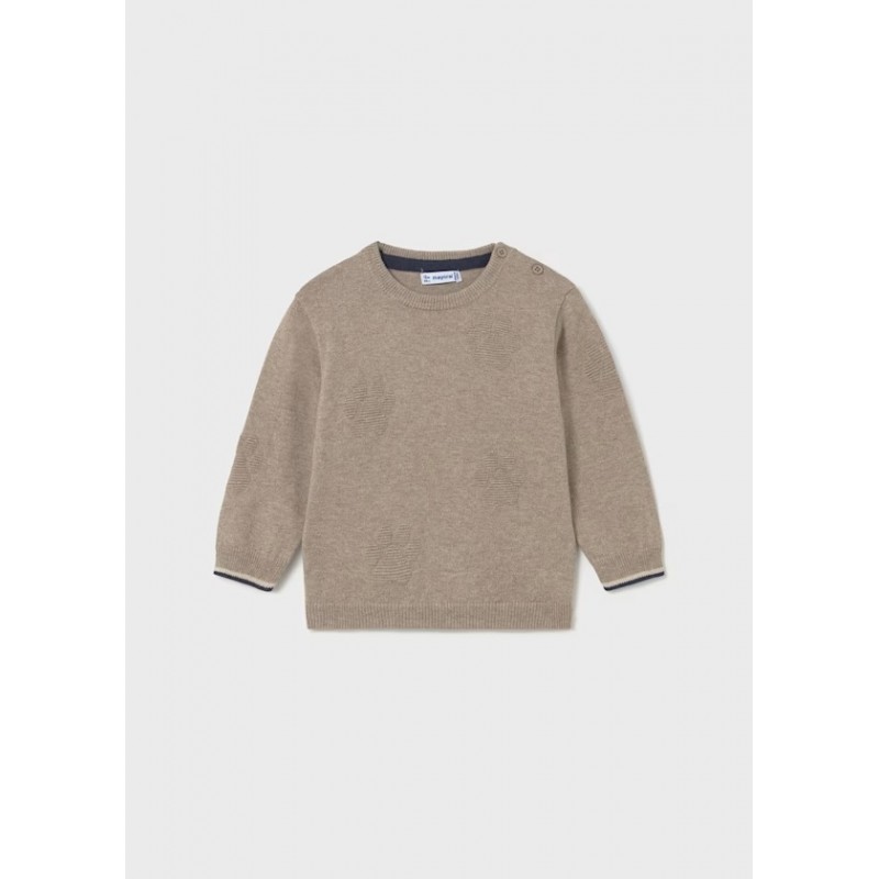 Круглий виріз горловини. Ґудзики на плечі для зручного одягання. Поєднання різних тканин для унікального та особливого дизайну. Декоративні елементи: ребристі деталі. В'язаний малюнок інтарсією.