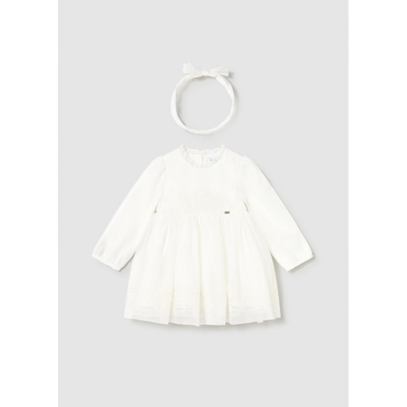 Дитяча сукня з пов'язкою на голову в тон. Дитяча сукня з довгими рукавами. Невидима застібка-блискавка ззаду. Виготовлена з легкого, струмливого фатину. На підкладці. Махровий фасон. Вишита обробка. Цей ексклюзивний виріб призначений для святкувань, подій та особливих випадків. Дитяча пов'язка на голову для церемонії, ідеальний аксесуар для найособливіших випадків.