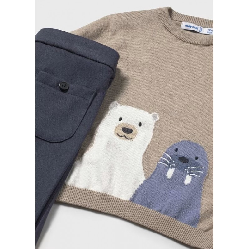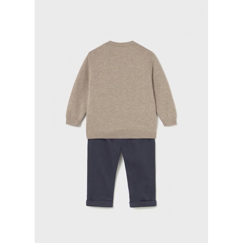 Дитячий светр з довгими рукавами. Круглий виріз горловини. Застібка на ґудзики на горловині для легкого регулювання. Вишита обробка. В'язаний візерунок інтарсія. Дитячі штани. Еластичний пояс із застібкою на ґудзики. Виріб з еластичним низом, що адаптується до зросту вашої дитини.
