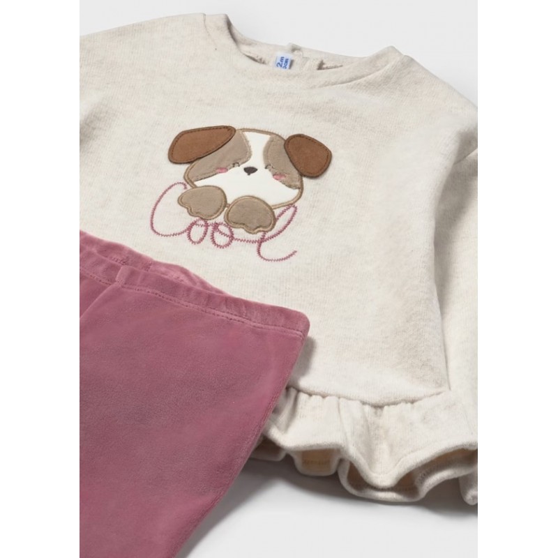 Світшот з довгими рукавами та еластичними манжетами. Круглий комір. Застібка на кнопці ззаду. Махрова та рюшована обробка. Декоративні елементи: аплікації, вишивка. Легінси для малюків. Еластичний пояс. Однотонний дизайн.