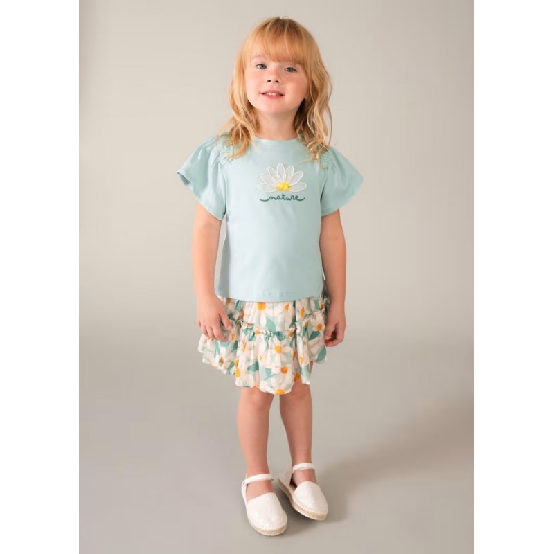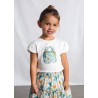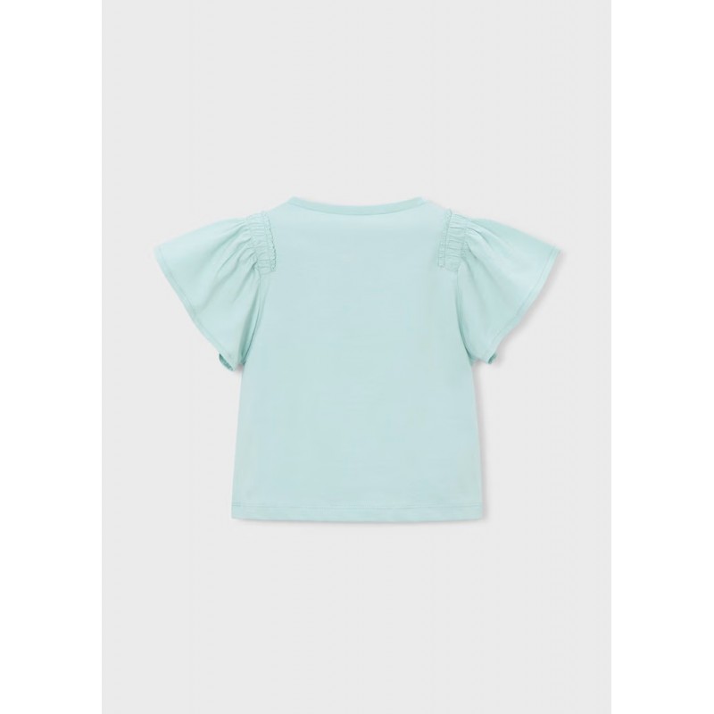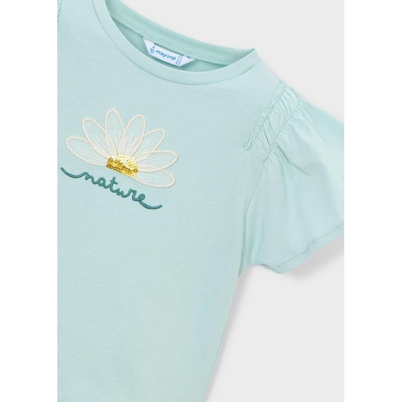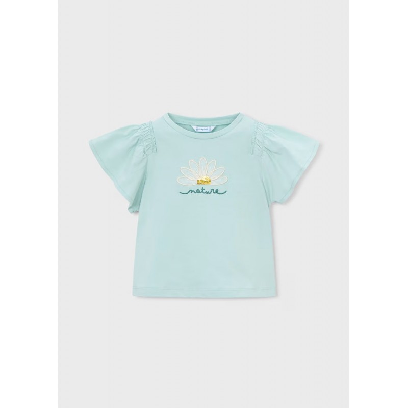 Круглий виріз горловини. Рукави з рюшами. Вишита деталь спереду.